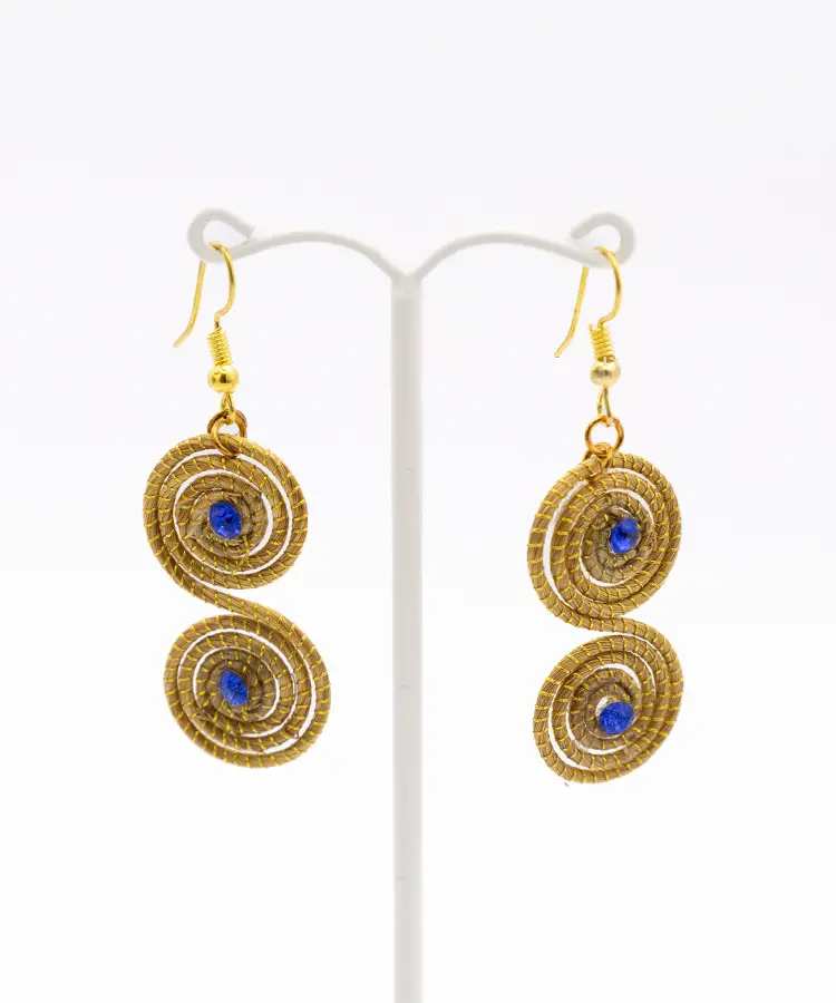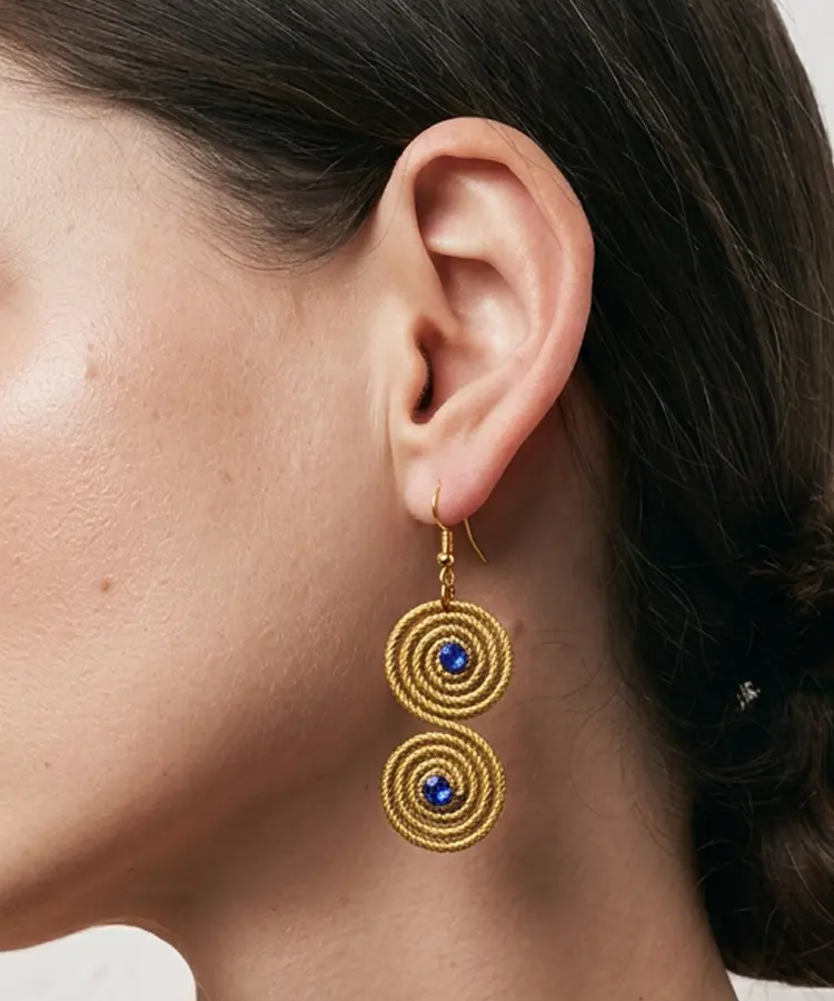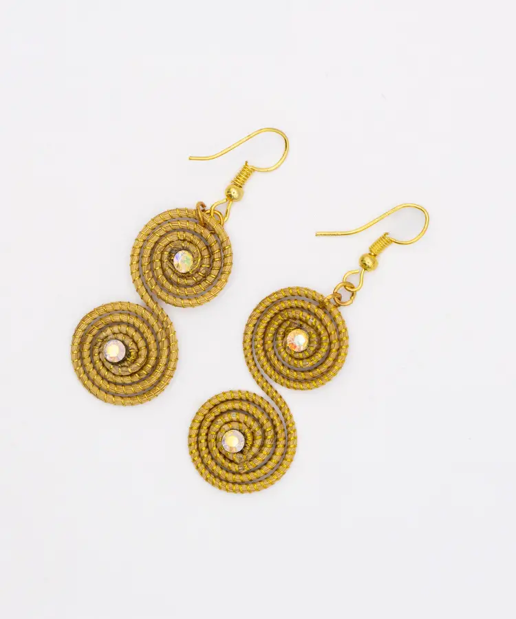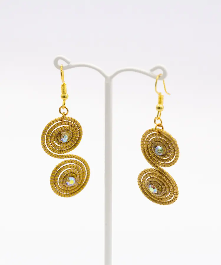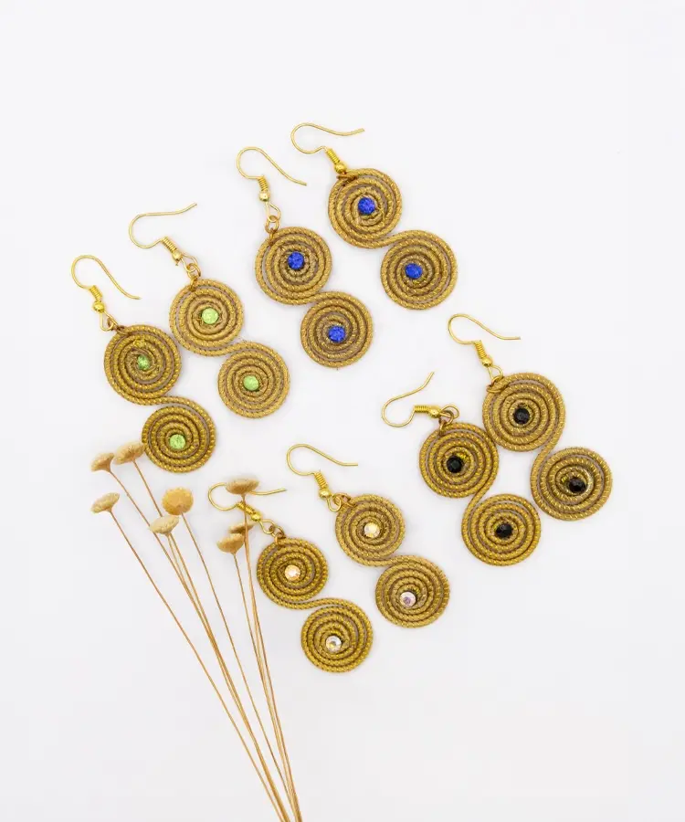 Pendientes en Capim Dourado (oro vegetal) con forma de caracola. Ligeros, luminosos y con una elegancia muy natural. El cristal Swarovski añade destellos sutiles, manteniendo una estética serena.